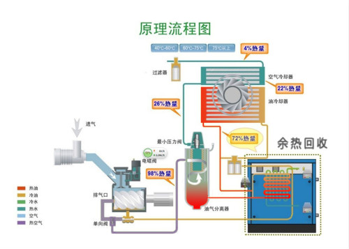 在以上過程中,高溫高壓的油、氣所攜帶的熱量大致相當于空氣壓縮機功率的3/4其溫度通常在80℃—100℃之間。螺桿式空氣壓縮機通過其自身的散熱系統(tǒng)來給高 溫高壓的油、氣降溫的過程中,大量的熱能_被無端的浪費了。