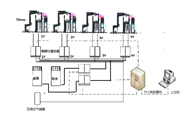 尿素溶液經(jīng)配制并儲存后,由在線稀釋系統(tǒng)根據(jù)鍋爐運行情況和NOx排放濃度情況在線稀釋成所需的噴射量,送入噴射系統(tǒng)。噴射系統(tǒng)實現(xiàn)各噴射層的尿素溶液分配、霧化噴射和計量,還原劑的供應(yīng)量能滿足鍋爐不同負荷的要求。整套電氣控制系統(tǒng)調(diào)節(jié)方便、靈活、可靠,在設(shè)備間、爐房噴點現(xiàn)場及控制室均能聯(lián)動控制。鍋爐脫硝整體工藝流程如下: