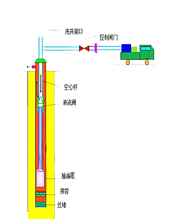 特征:將洗井裝置從油井的井口下入油管中;洗井裝置從油井井口自上至下是抽油桿懸繩器短節、空心桿兩通、空心桿光桿、空心抽油桿、洗井單流閥、抽油桿、抽油泵柱塞。抽油桿懸繩器短節與空心桿兩通之間螺紋連接、空心桿兩通與空心桿光桿之間螺紋連接、空心桿光桿與空心抽油桿之間螺紋連接、空心抽油桿與洗井單流閥之間螺紋連接、洗井單流閥與抽油桿之間螺紋連接、抽油桿與抽油泵柱塞之間螺紋連接。